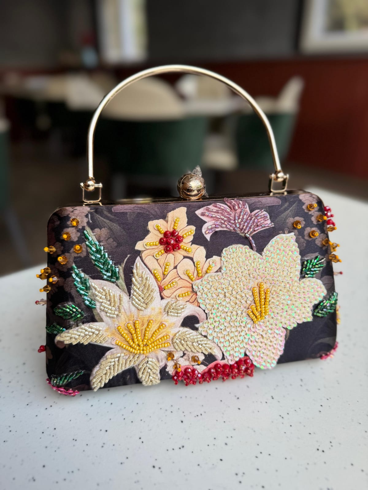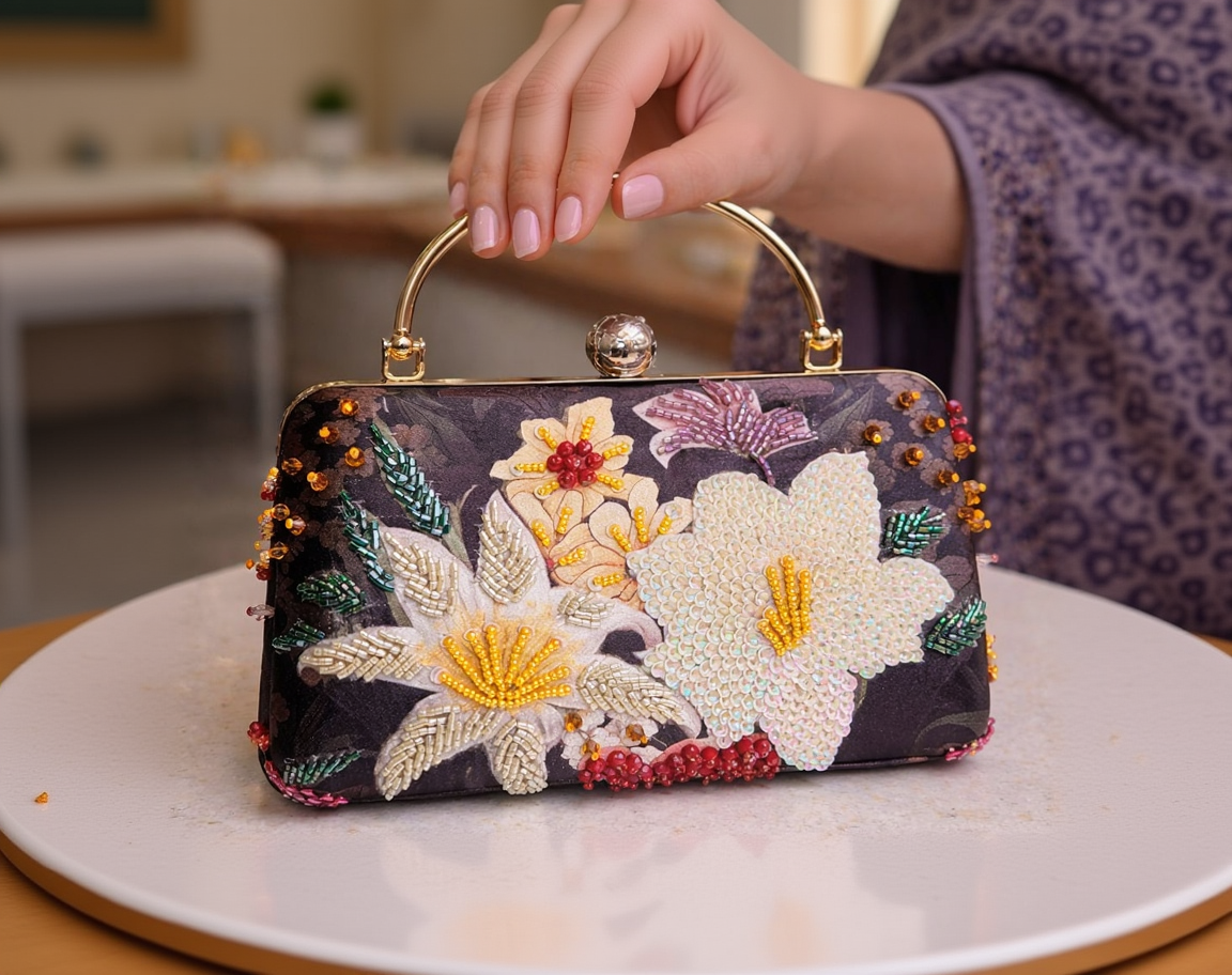Carry this elegant accessory with ease using the sturdy handle or adjustable sling chain. Adorned with delicate floral beads on luxurious black silk, it's the ideal companion for Indian weddings, festivals, and traditional celebrations. A timeless piece that adds sophistication to any festive occasion.