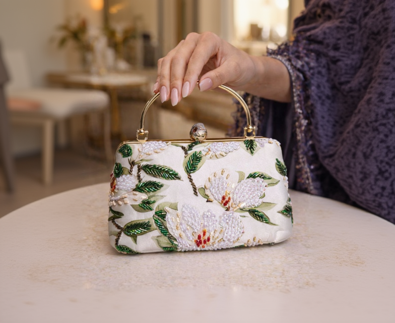Carry this elegant accessory with ease using the sturdy handle or adjustable sling chain. Adorned with delicate white floral beads on luxurious white silk, it's the ideal companion for Indian weddings, festivals, and traditional celebrations. A timeless piece that adds sophistication to any festive occasion.
