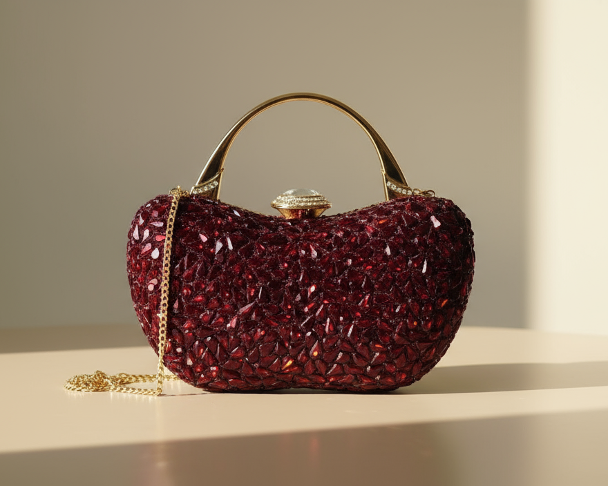 Elevate your evening look with this stunning red clutch, adorned with sparkling crystal stones and a graceful golden handle. The intricate embellishments on both sides create a luxurious finish, while the included sling chain offers versatile styling options. A sophisticated accessory that transforms any formal occasion into a memorable moment.