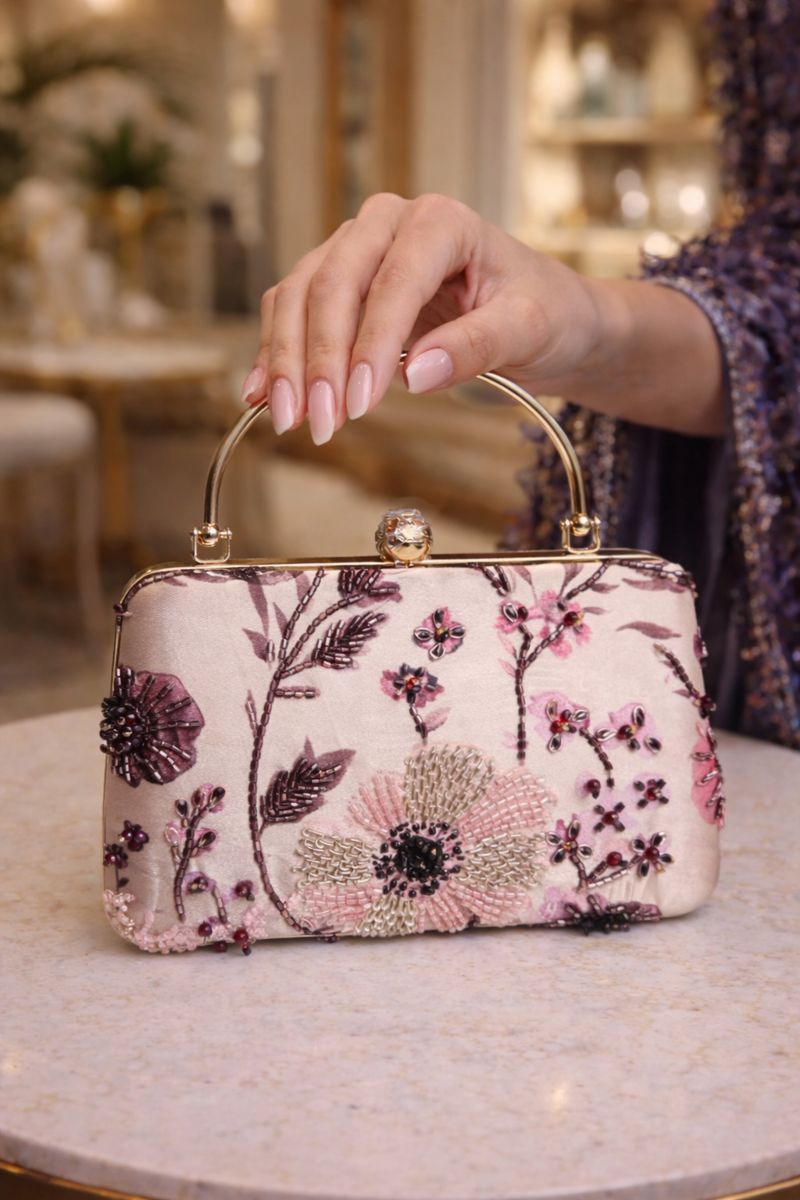 Carry this elegant accessory with ease using the sturdy handle or adjustable sling chain. Adorned with delicate Purple floral beads on luxurious silk, it's the ideal companion for Indian weddings, festivals, and traditional celebrations. A timeless piece that adds sophistication to any festive occasion.